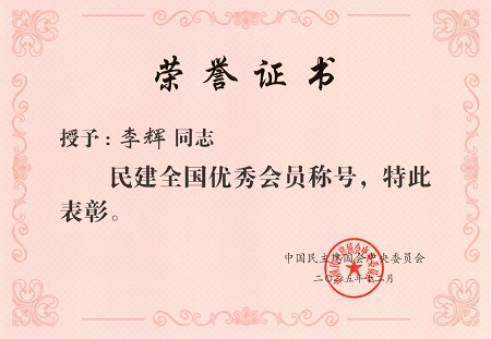 12月17日,庆祝中国民主建国会成立80周年大会在北京召开,大会对全国600名优秀会员、210名全国优秀会务工作者及310个先进民建组织予以表彰。其中,民建肇庆高要支部主委、广东晟辉科技股份有限公司董事长李辉获得民建“全国优秀会员”荣誉称号。