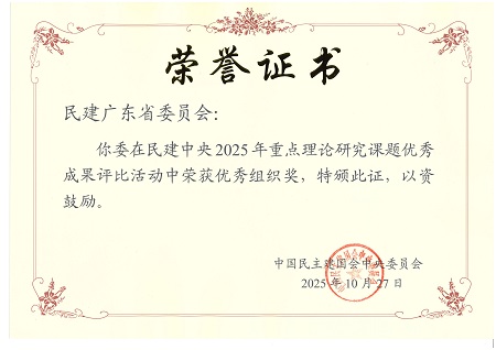 民建广东省委会荣获民建中央重点理论研究课题优秀成果评比优秀组织奖。