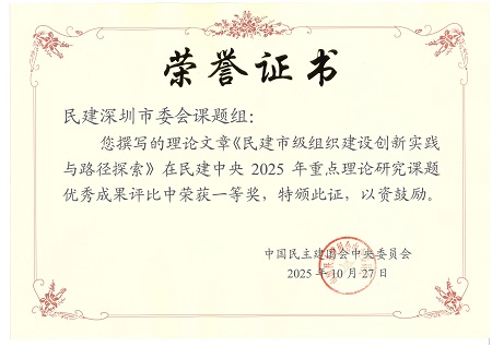 民建深圳市委会课题组(乔恒利、吴伟旺)撰写的《民建市级组织建设创新实践与路径探索》荣获优秀成果评比一等奖。