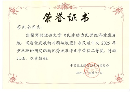 中山蔡先全撰写的《民建助力民营经济健康发展、高质量发展的回顾与展望》荣获优秀成果评比二等奖。