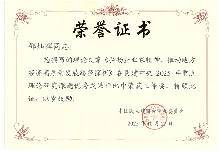 惠州邵灿辉撰写的《弘扬企业家精神,推动地方经济高质量发展路径探析》荣获优秀成果评比三等奖。
