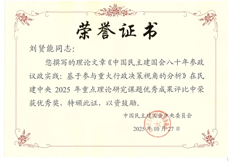 云浮刘贤能撰写的《中国民主建国会八十年参政议政实践:基于参与重大行政决策视角的分析》荣获优秀成果评比优秀奖。