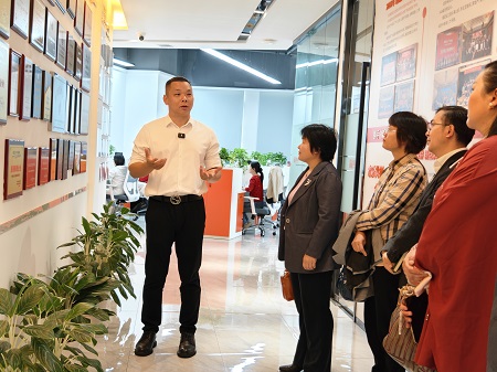 调研中,罗宁弟对徐晓雯一行的到来表示热烈欢迎,对市委会一直以来的关怀支持致以诚挚感谢。他带领调研组参观了企业展厅,结合企业发展历程展板、荣誉墙等,介绍了欢创集团自2010年成立以来的发展脉络、品牌建设成果及未来战略规划。
